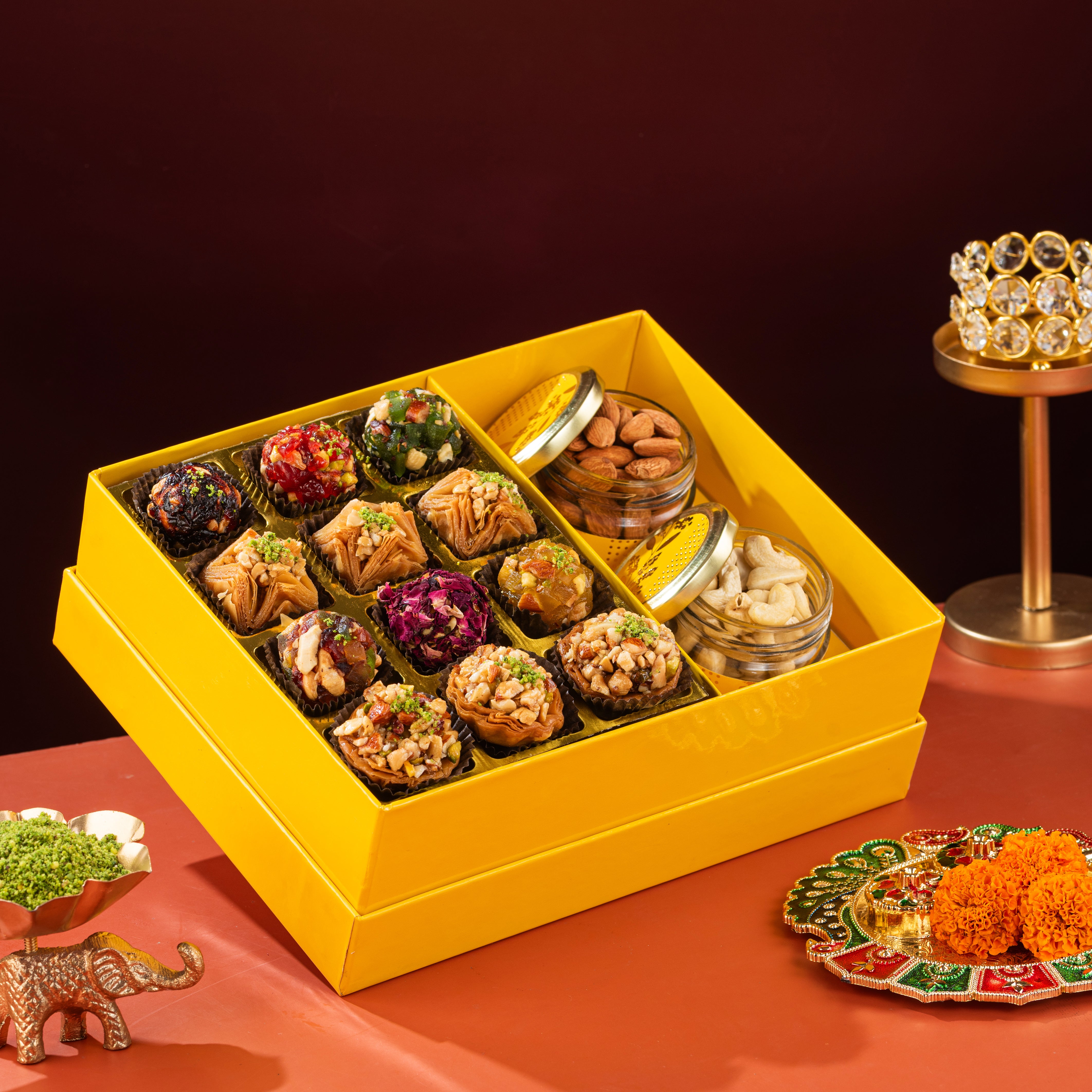The Festive Gift Box is a delightful curation of authentic flavors, premium ingredients, and timeless indulgence. From golden, flaky baklava to artistic Indian fusion sweets and gourmet dry fruits, every bite is crafted to spread joy and togetherness.