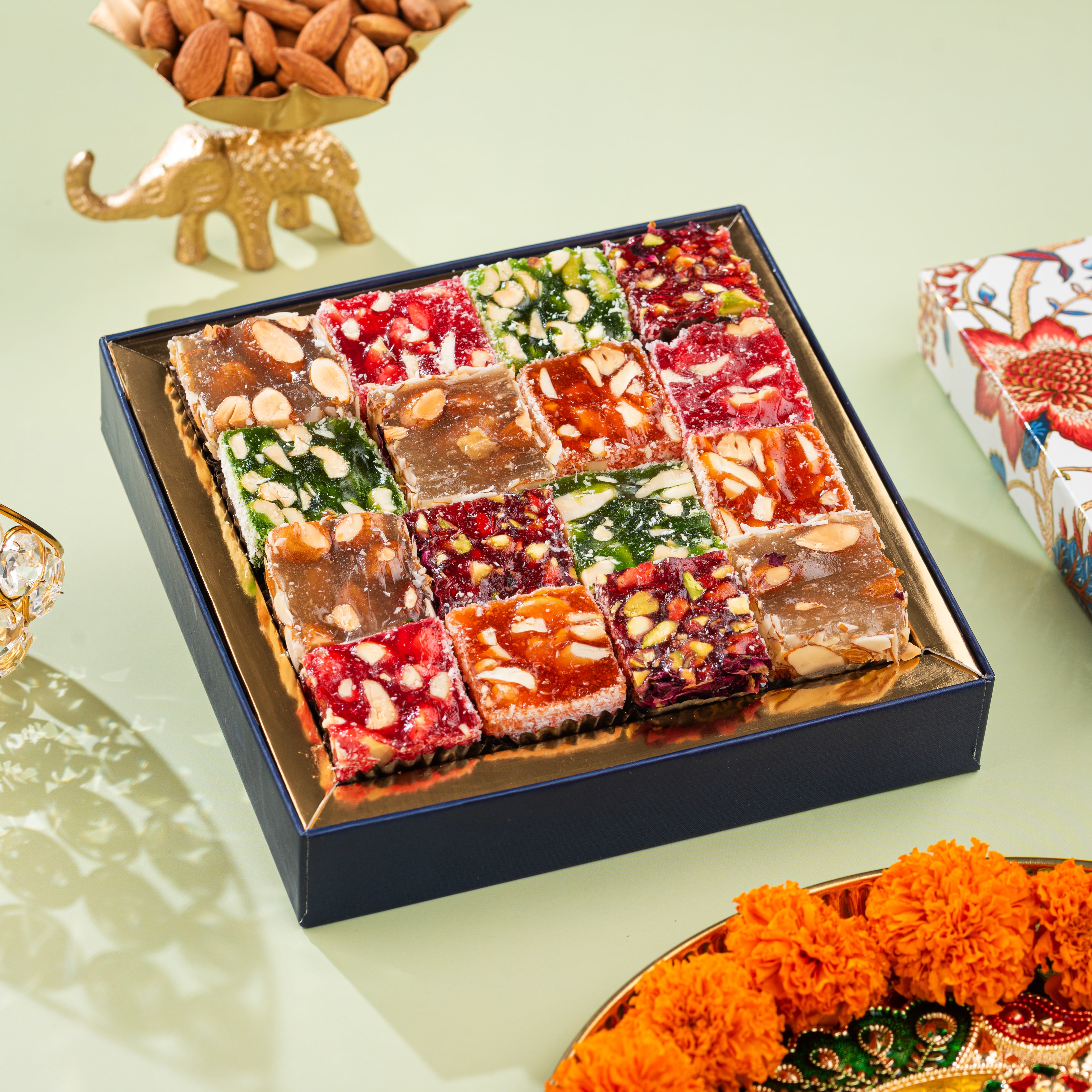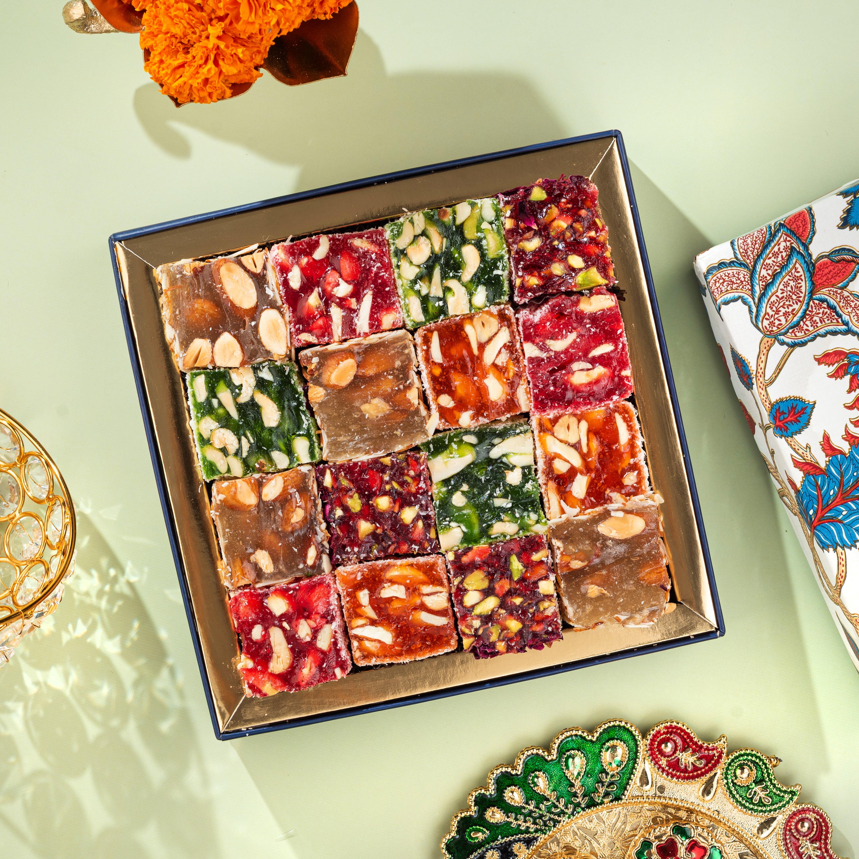 The Festive Gift Box is a delightful curation of authentic flavors, premium ingredients, and timeless indulgence. From golden, flaky baklava to artistic Indian fusion sweets and gourmet dry fruits, every bite is crafted to spread joy and togetherness.