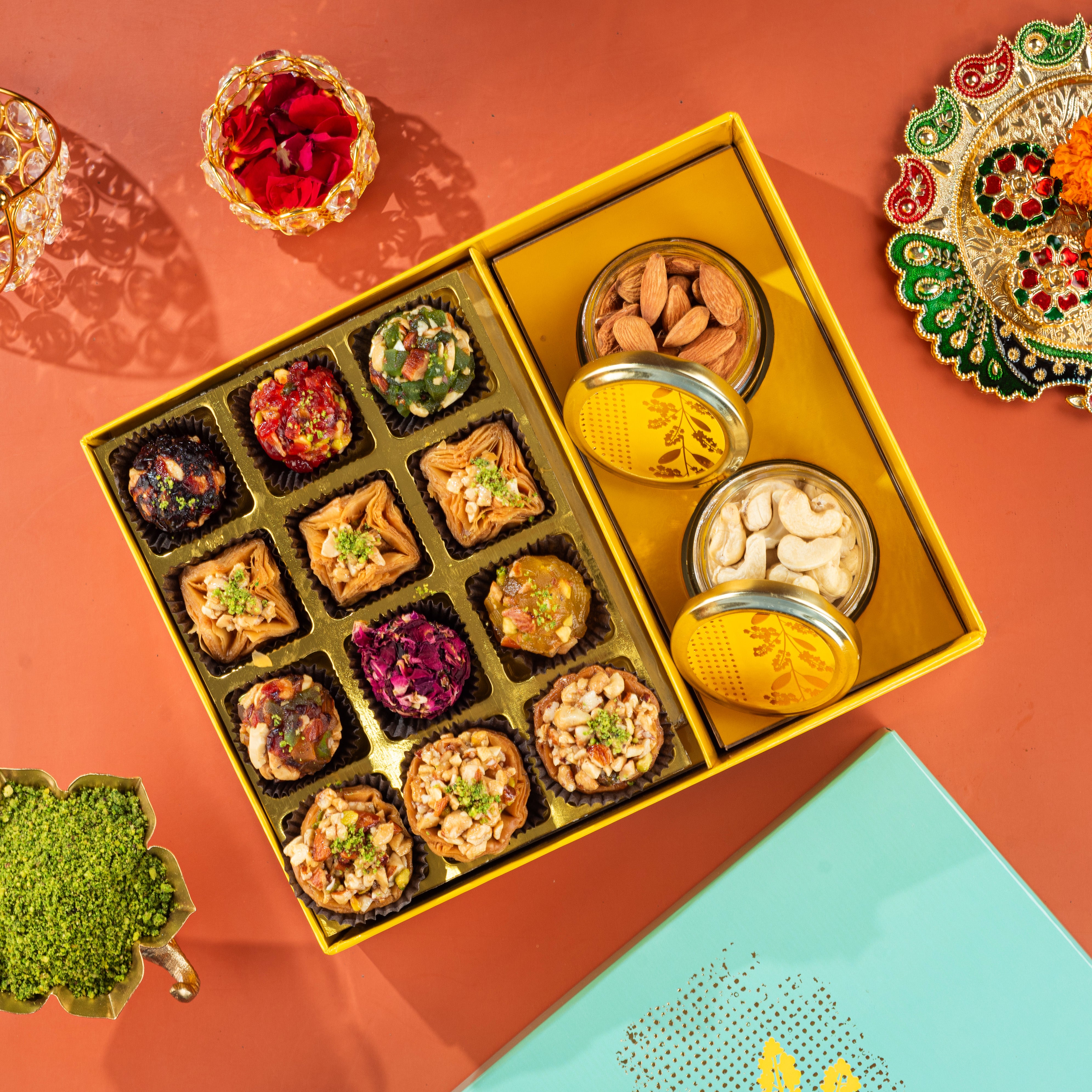 Celebrate Eid with a vibrant expression of tradition and indulgence. The Turquoise Assorted Baklava, Fusion Laddu & Dryfruit Hamper Sweets Box is a thoughtfully curated selection that brings together the rich flavours of premium baklava, innovative fusion laddus, and the wholesome goodness of handpicked dry fruits.