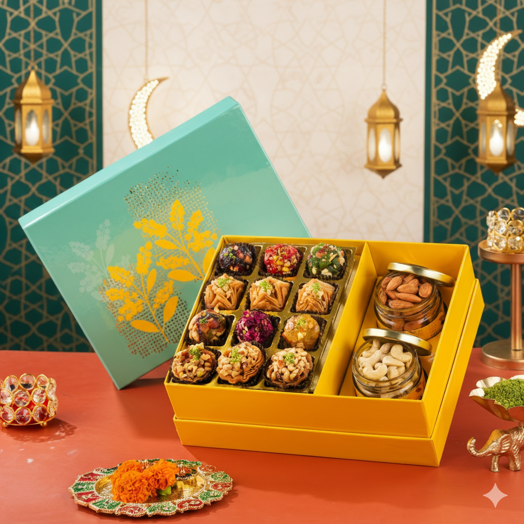 Designed for festive gifting and joyful sharing, each element in this hamper reflects fine craftsmanship, quality ingredients, and a perfect balance of taste and texture. Beautifully presented and hygienically packed to preserve freshness, this hamper is ideal for Eid celebrations, family gatherings, and special occasions.