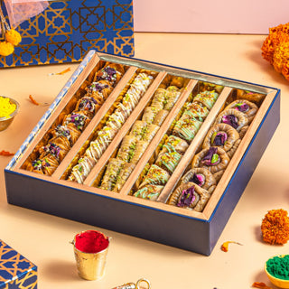 The Festive Gift Box is a delightful curation of authentic flavors, premium ingredients, and timeless indulgence. From golden, flaky baklava to artistic Indian fusion sweets and gourmet dry fruits, every bite is crafted to spread joy and togetherness.
