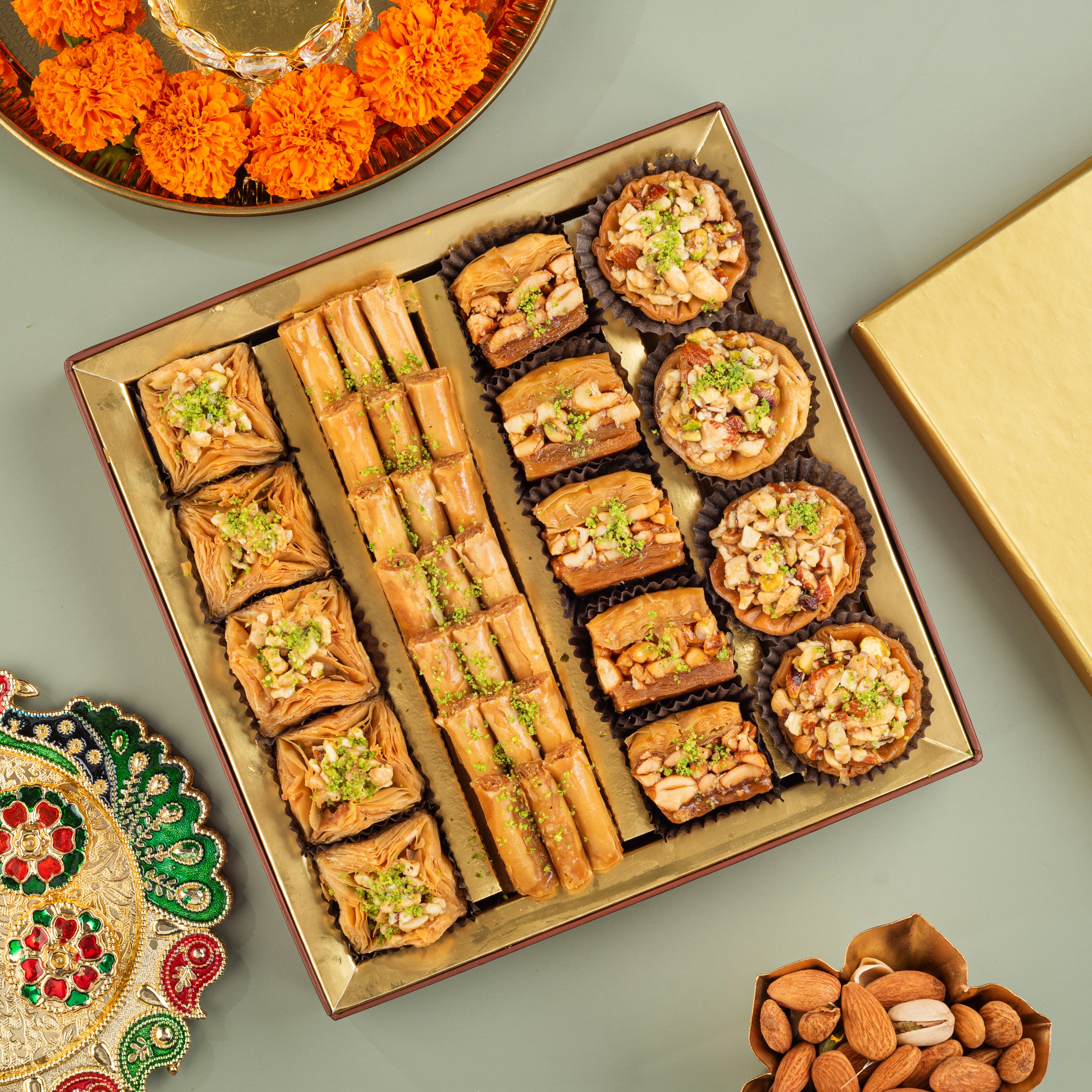 The Festive Gift Box is a delightful curation of authentic flavors, premium ingredients, and timeless indulgence. From golden, flaky baklava to artistic Indian fusion sweets and gourmet dry fruits, every bite is crafted to spread joy and togetherness.