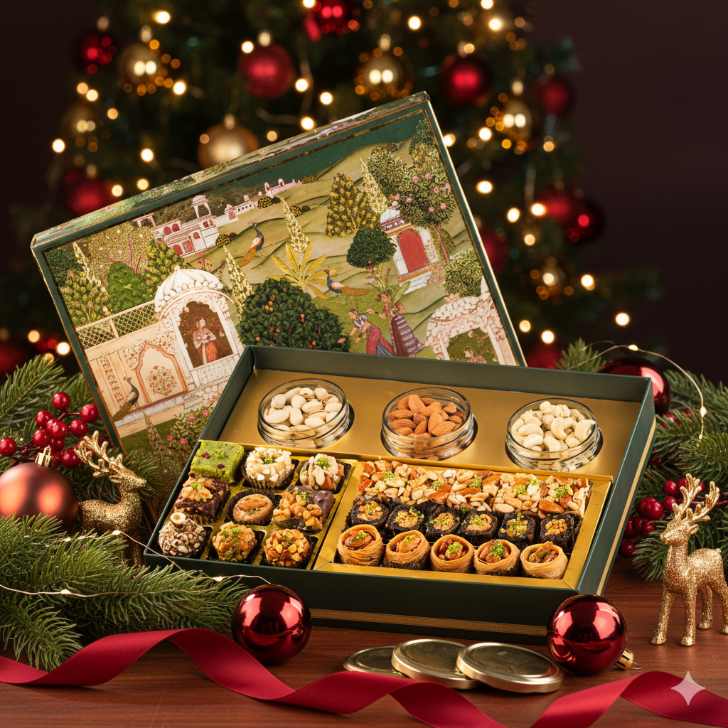 Celebrate Christmas the opulent way with The Baklava Box’s Mayur Mahal Assorted Christmas Box, a luxurious assortment inspired by royal Indian artistry and classic Middle Eastern indulgence. This grand collection brings together premium baklavas, elegant Indian artistic sweets, and three kinds of hand-selected dry fruits — almonds, cashews, and pistachios.