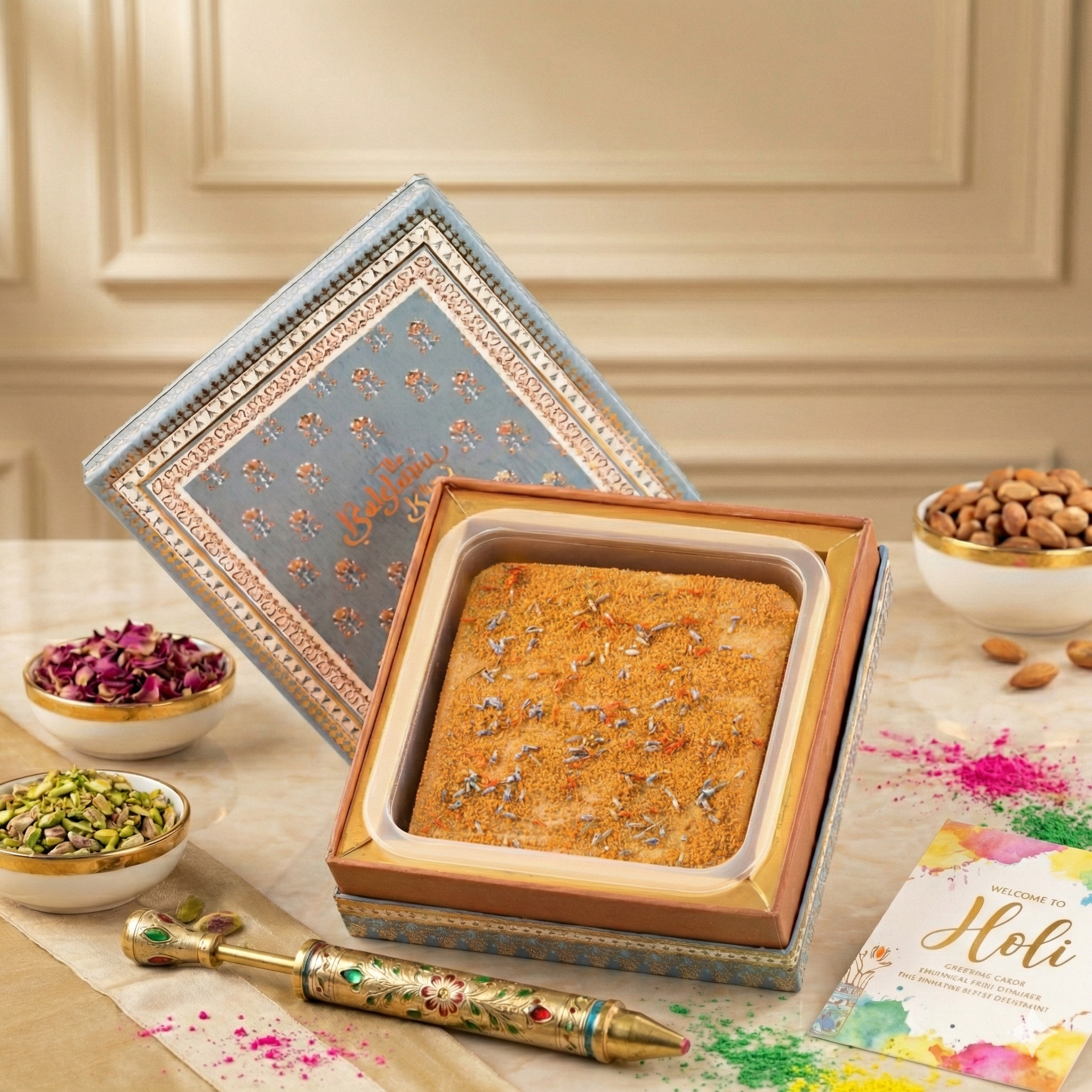 Celebrate the spirit of Holi with a hamper that blends timeless tradition and refined indulgence. Our Holi Baklava & Dryfruit Box features handcrafted baklava layered with rich pistachios, premium walnuts, and golden honeyed sweetness, paired with an assortment of carefully selected dry fruits for a wholesome festive touch.