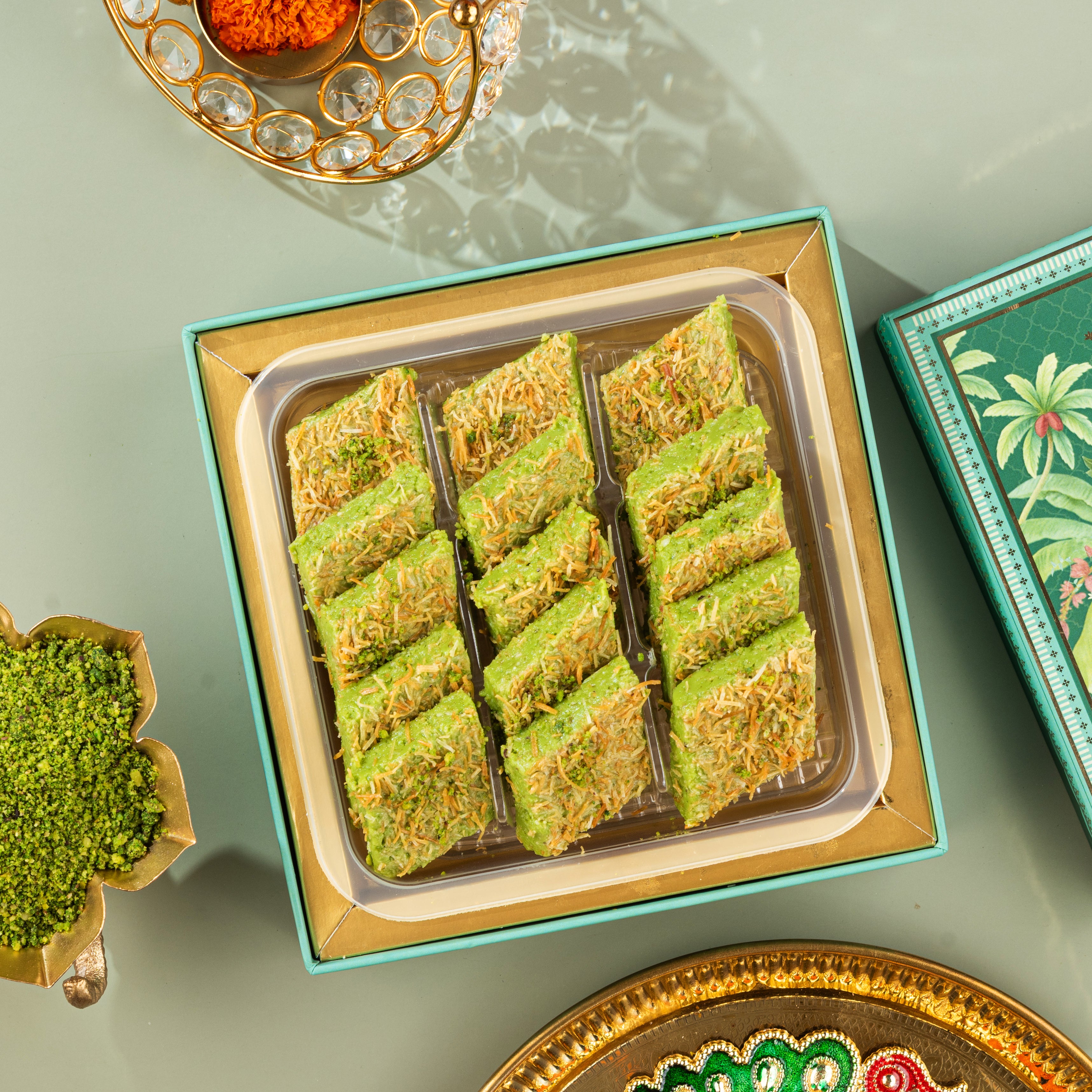The Noor Assorted Pistachio Kunafa Barfi is a premium mithai combining the creamy richness of traditional barfi with crunchy kunafa and the nutty essence of pistachios. Each piece is handcrafted to perfection, delivering a luxurious sweet that’s both traditional and innovative. Packed hygienically to retain quality and taste, this sweet is perfect for festive gifting, weddings, or personal indulgence. The product you receive will be exactly the same as shown in the picture, with the promised quantity. A truly indulgent mithai, it brings elegance and joy to every occasion.
