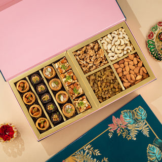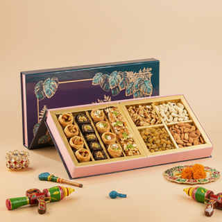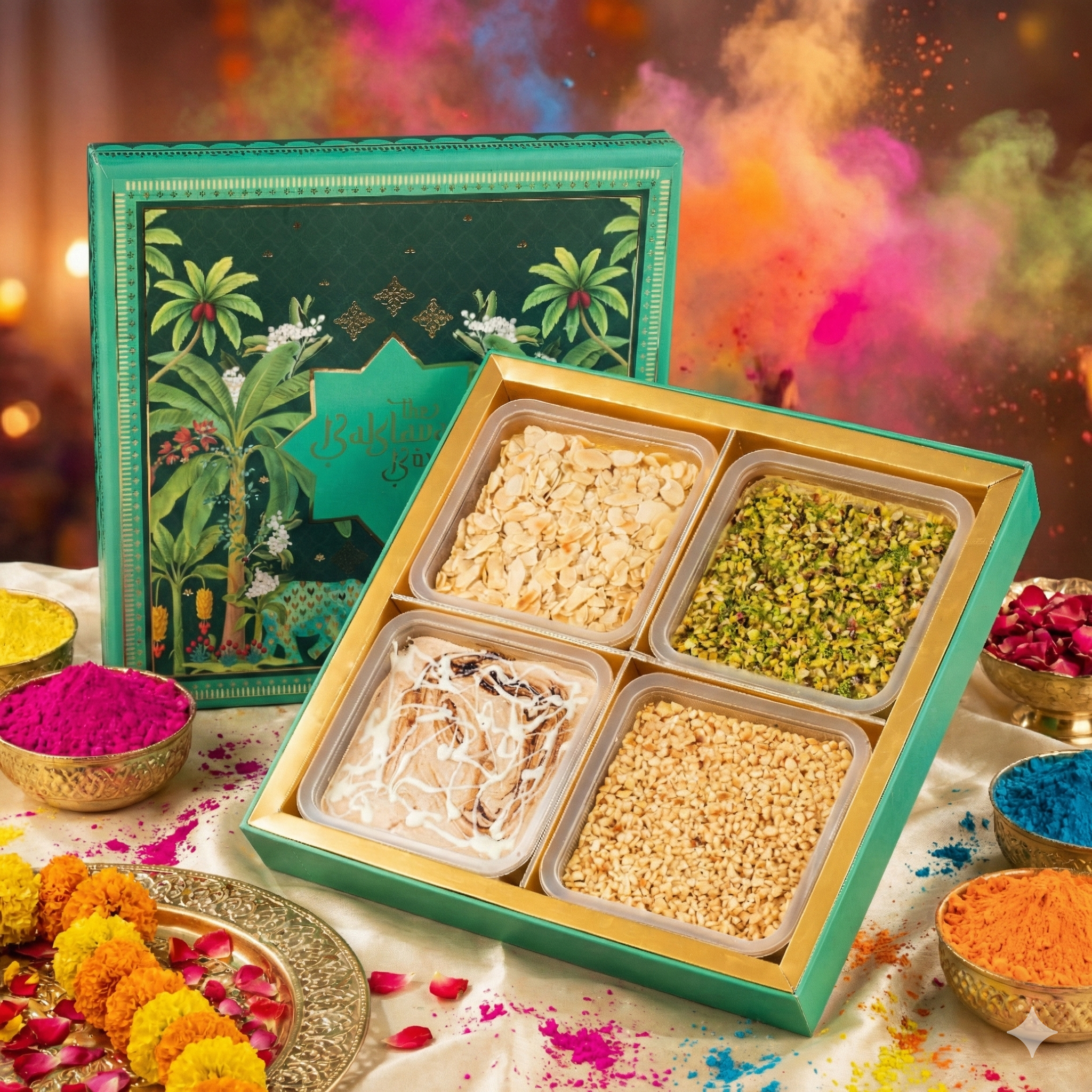 Celebrate the spirit of Holi with a hamper that blends timeless tradition and refined indulgence. Our Holi Baklava & Dryfruit Box features handcrafted baklava layered with rich pistachios, premium walnuts, and golden honeyed sweetness, paired with an assortment of carefully selected dry fruits for a wholesome festive touch.