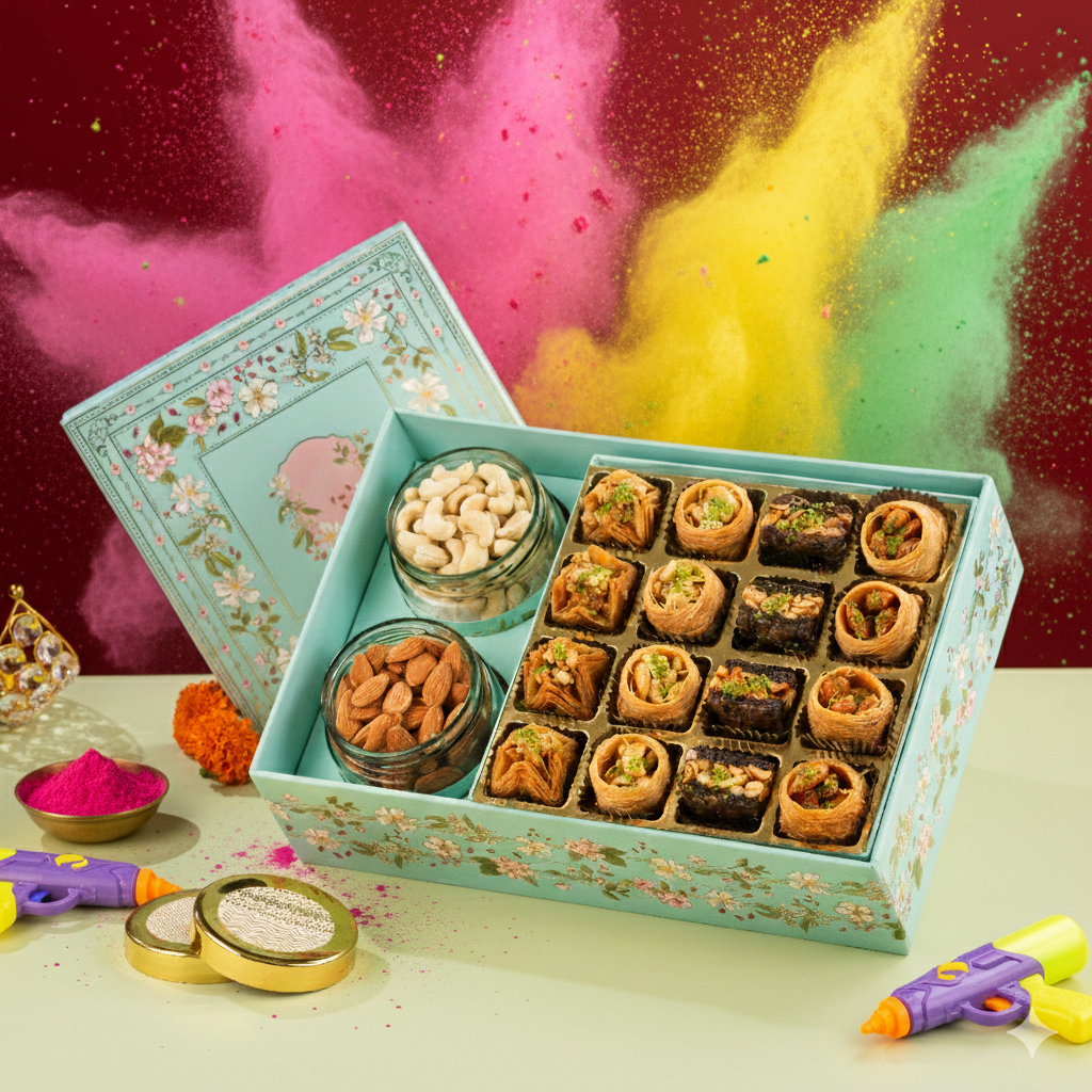 Celebrate the spirit of Holi with a hamper that blends timeless tradition and refined indulgence. Our Holi Baklava & Dryfruit Box features handcrafted baklava layered with rich pistachios, premium walnuts, and golden honeyed sweetness, paired with an assortment of carefully selected dry fruits for a wholesome festive touch.