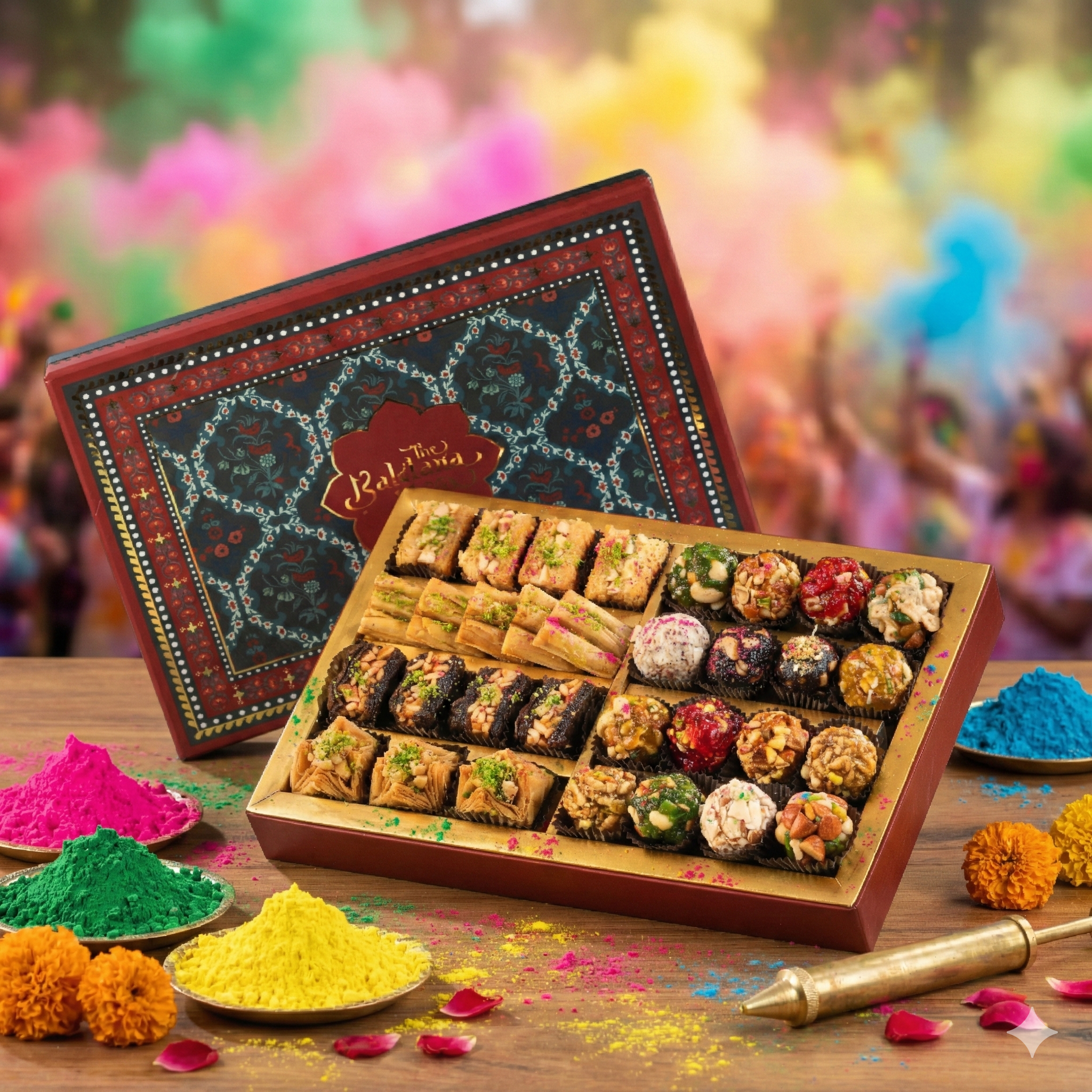 Celebrate the spirit of Holi with a hamper that blends timeless tradition and refined indulgence. Our Holi Baklava & Dryfruit Box features handcrafted baklava layered with rich pistachios, premium walnuts, and golden honeyed sweetness, paired with an assortment of carefully selected dry fruits for a wholesome festive touch.