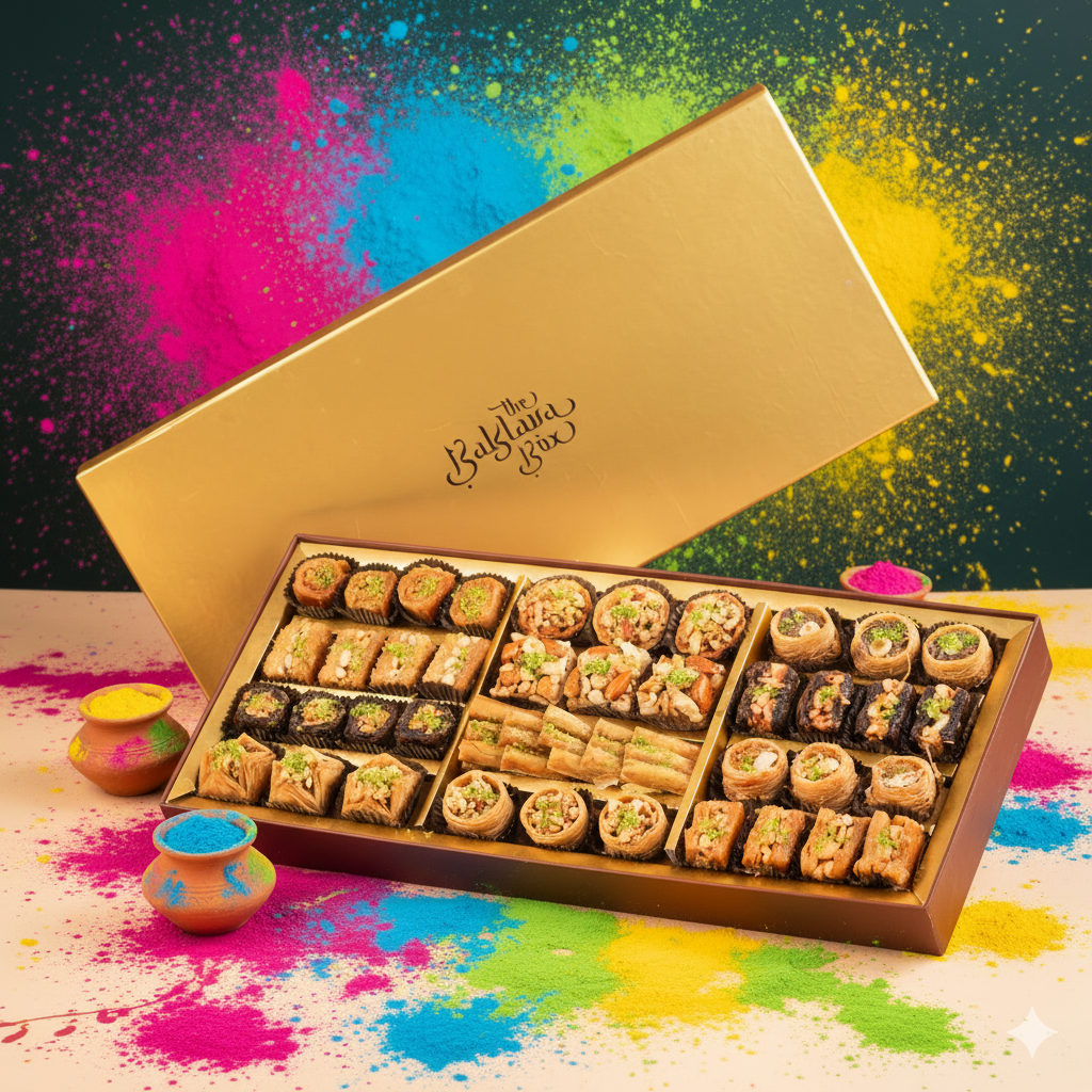 Celebrate the spirit of Holi with a hamper that blends timeless tradition and refined indulgence. Our Holi Baklava & Dryfruit Box features handcrafted baklava layered with rich pistachios, premium walnuts, and golden honeyed sweetness, paired with an assortment of carefully selected dry fruits for a wholesome festive touch.